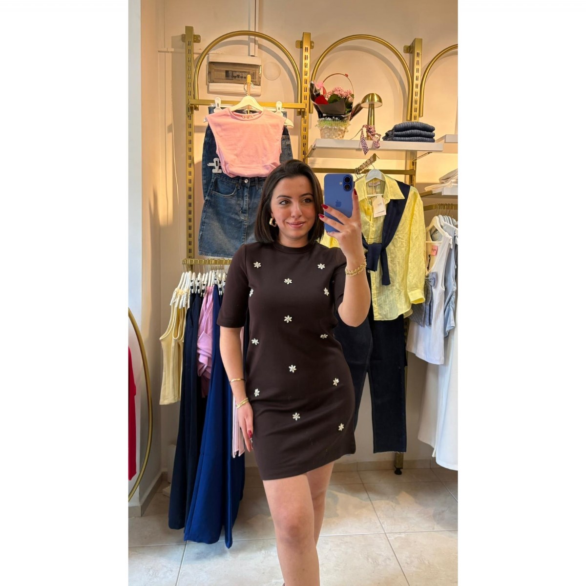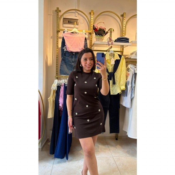 Çiçek Taş Detaylı Mini Elbise